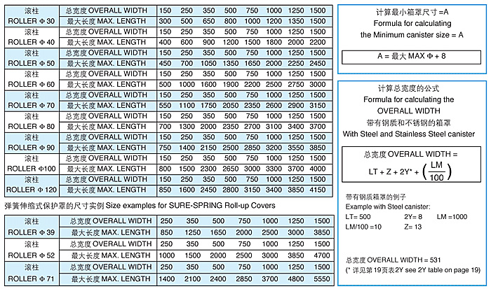 推薦的尺寸:這些表格根據(jù)總寬度給出了最大的板的長度。在最大速度40米/分鐘的條件下,這些值都是保證值。對更高的速度以及那些沒有包括在這些表中的值,請與我們的工程設(shè)計(jì)部門聯(lián)系。所有帶或不帶箱罩的伸縮式保護(hù)罩都可以按訂單要求制作。