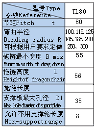 拖鏈型號(hào)TL80,支撐板Ⅲ型,彎曲半徑R=125,支撐板寬度Bi=200,拖鏈長(zhǎng)度L=6500